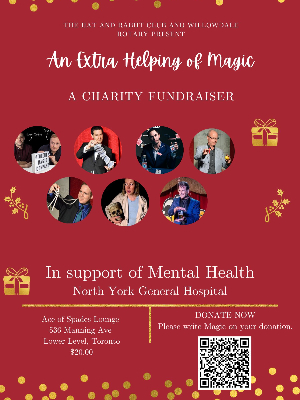 This fun and interactive magic show is not just about illusion but also making a real difference. As we gather online at this memorable event, with some of Toronto’s finest magicians, we'll be raising critical funds to support mental health initiatives in Toronto and in support of the North York General Hospital.